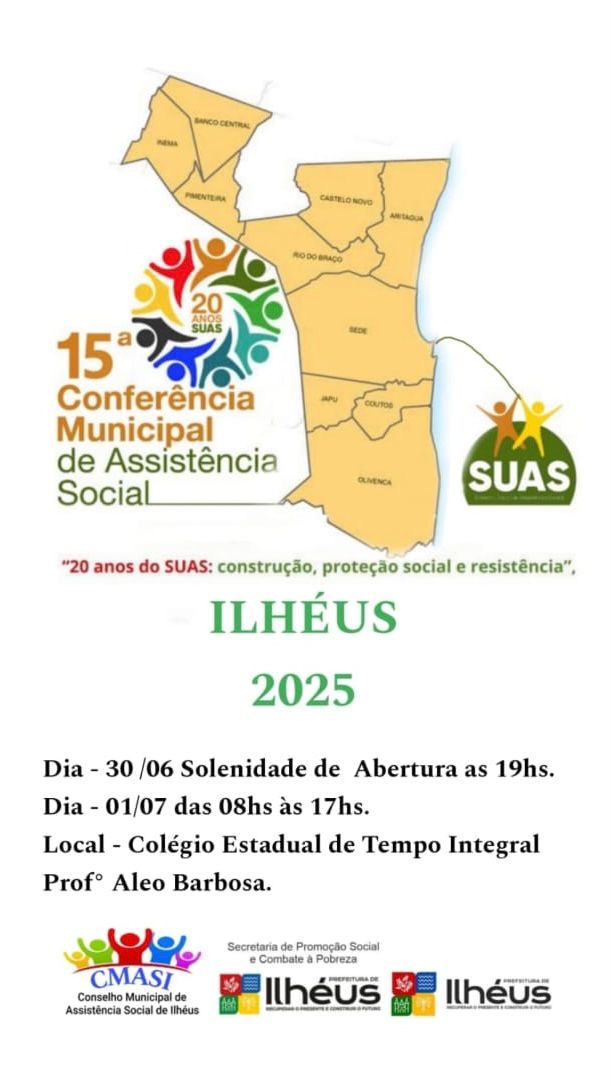O município de Ilhéus realiza, nos dias 30 de junho e 1º de julho, a 15ª Conferência Municipal de Assistência Social. O evento é promovido pelo Conselho Municipal de Assistência Social (CMAS), com apoio da Prefeitura, por meio da Secretaria de Promoção Social e Combate à Pobreza.