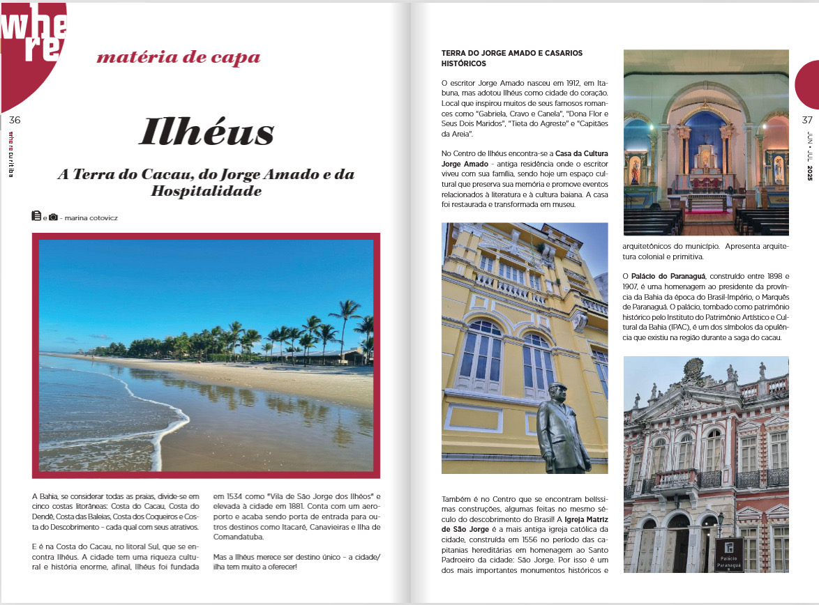 A cidade de Ilhéus foi tema de uma reportagem especial da revista Where Curitiba, voltada ao turismo e lifestyle. A publicação foi resultado de uma press trip promovida pelo Jardim Atlântico Beach Resort, que recebeu jornalistas de diferentes estados para uma imersão nas belezas e experiências que o município oferece.